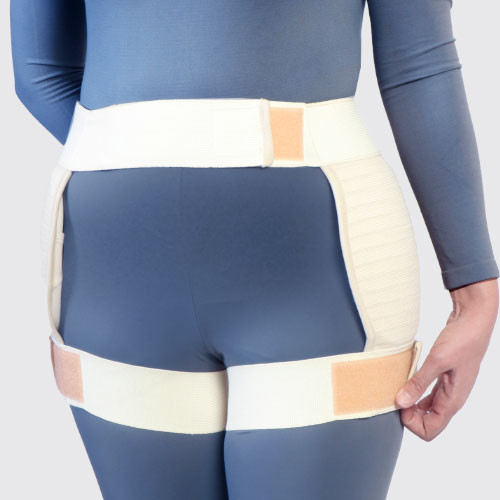 · کش‌ها را با استفاده از چسبک‌های پشت و جلو به دور کمر خود بگونه‌ای ببندید که پدهای لگنی بصورت متقارن در دو طرف لگن قرار بگیرند و برجستگی‌های مفصل ران را کاملاً پوشش دهند